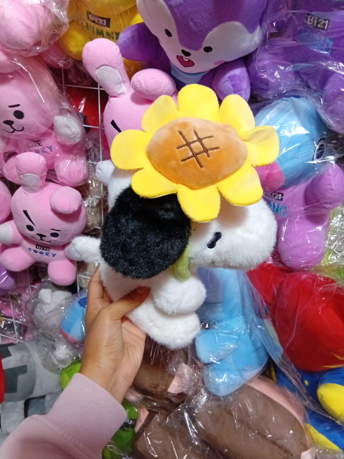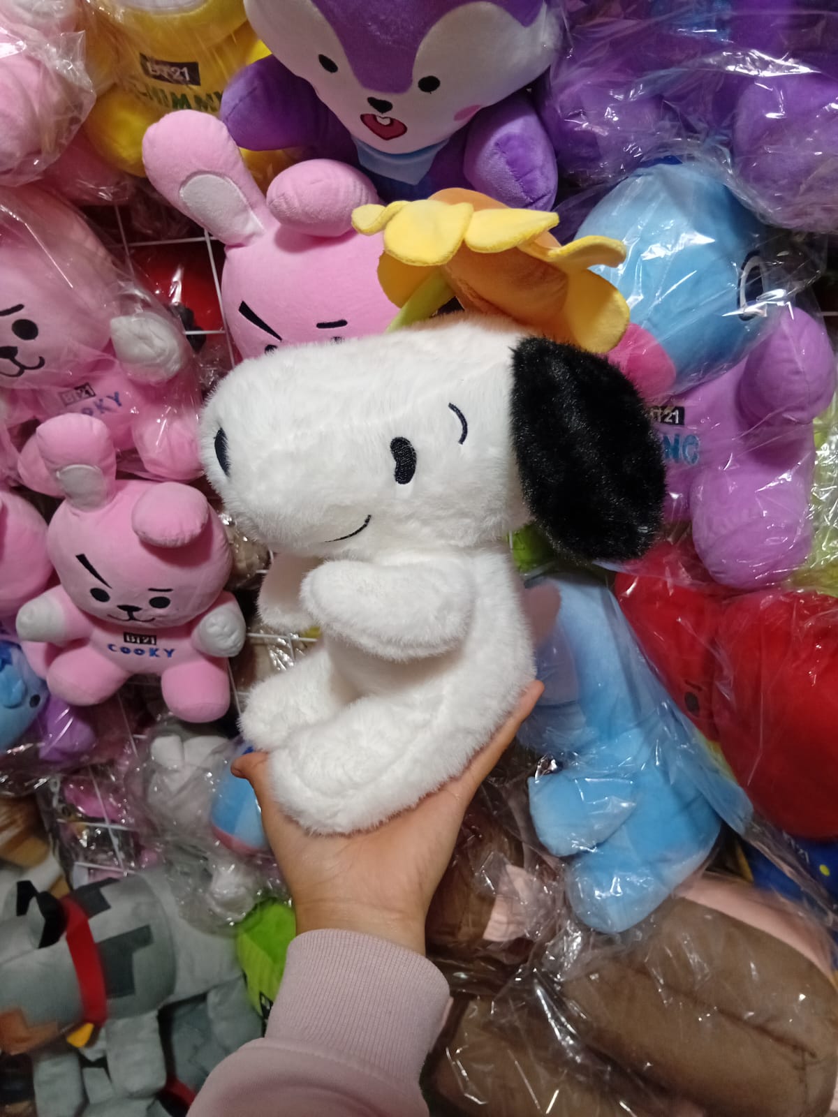 Peluche de Snoopy importado con girasol, fabricado con materiales suaves y de alta calidad.