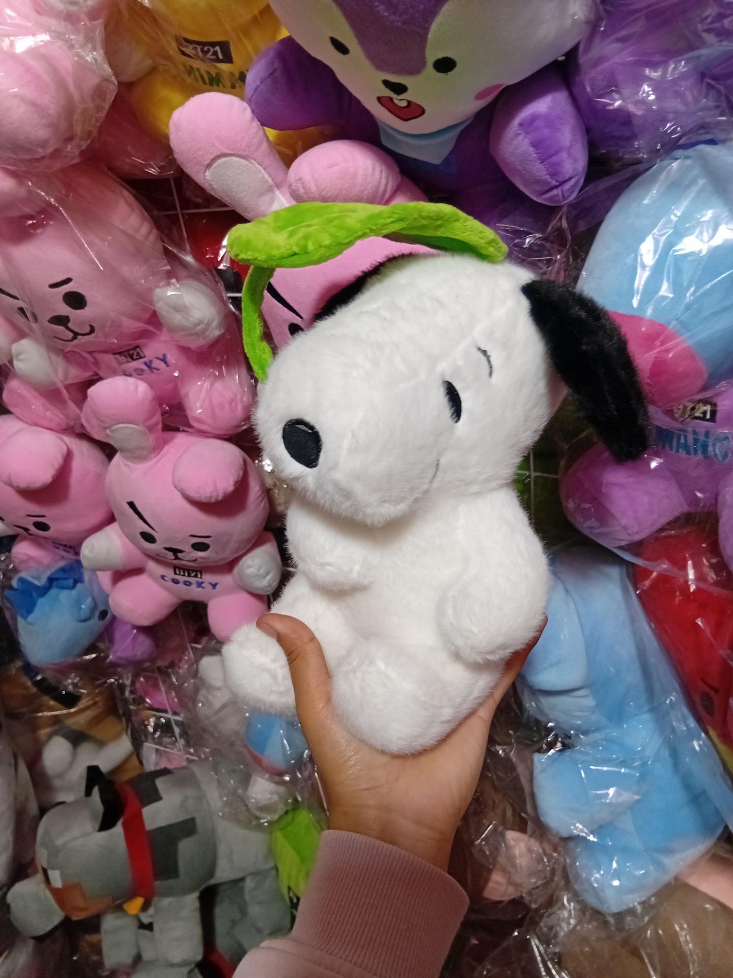 Peluche de Snoopy importado con girasol, fabricado con materiales suaves y de alta calidad.